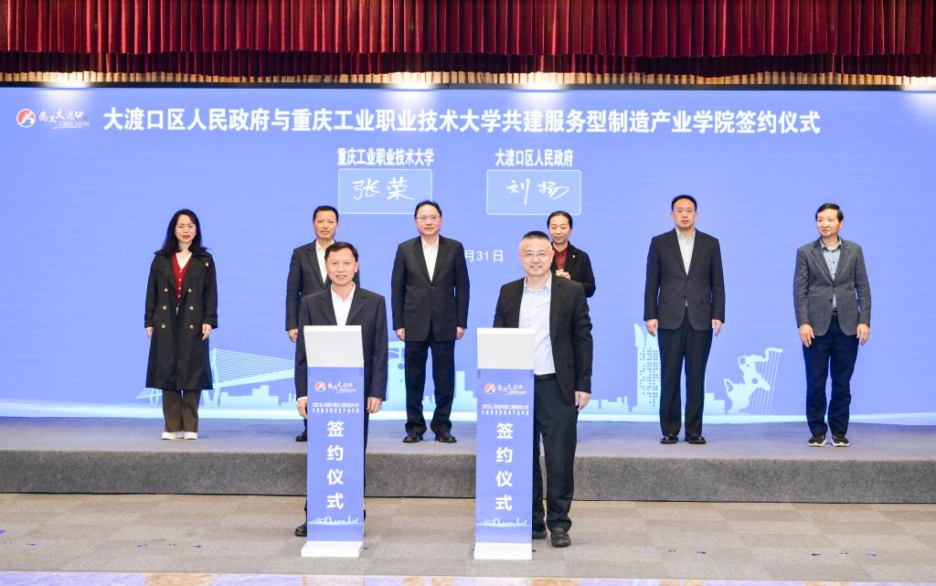 313月31日,重庆工业职业技术大学与大渡口区人民政府共建服务型制造产业学院签约仪式在大渡口区行政中心举行。市经信委二级巡视员卿知学、市教委职成教处处长吴岚,大渡口区委书记张果,区委副书记、区长张涛等区领导,我校党委书记郭天平、党委副书记张荣、副校长李雷出席,大渡...