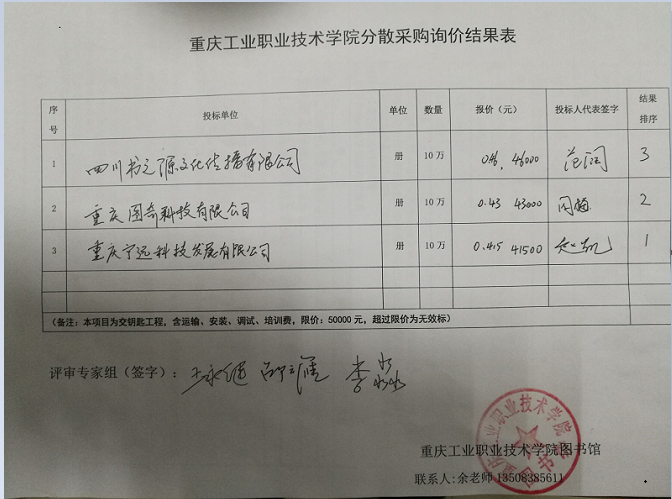 重庆工业职业技术学院分散采购询价结果公示