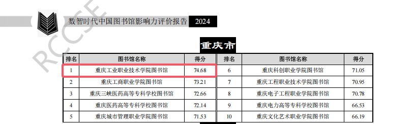 日前,武汉大学中国科学评价研究中心、中国科学与科技政策研究会科学计量学与信息计量学专业委员会联合开展了中国图书馆影响力评价工作,公开发布了《数智时代中国图书馆影响力评价报告(2024)》,我校图书馆影响力排名位居全国第56位、重庆市第一。