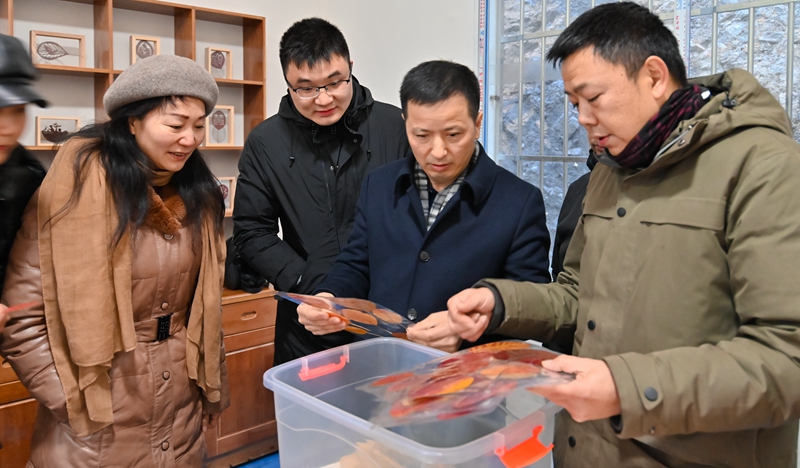 学校院长郭天平一行在安静村实地调研叶雕产品开发情况。