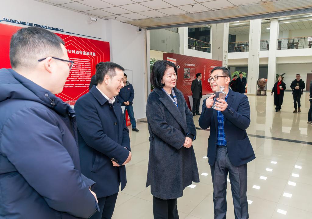 会前,与会领导来到学校科研成果展示厅,详细了解了各类成果研究价值、目的和社会效益等。