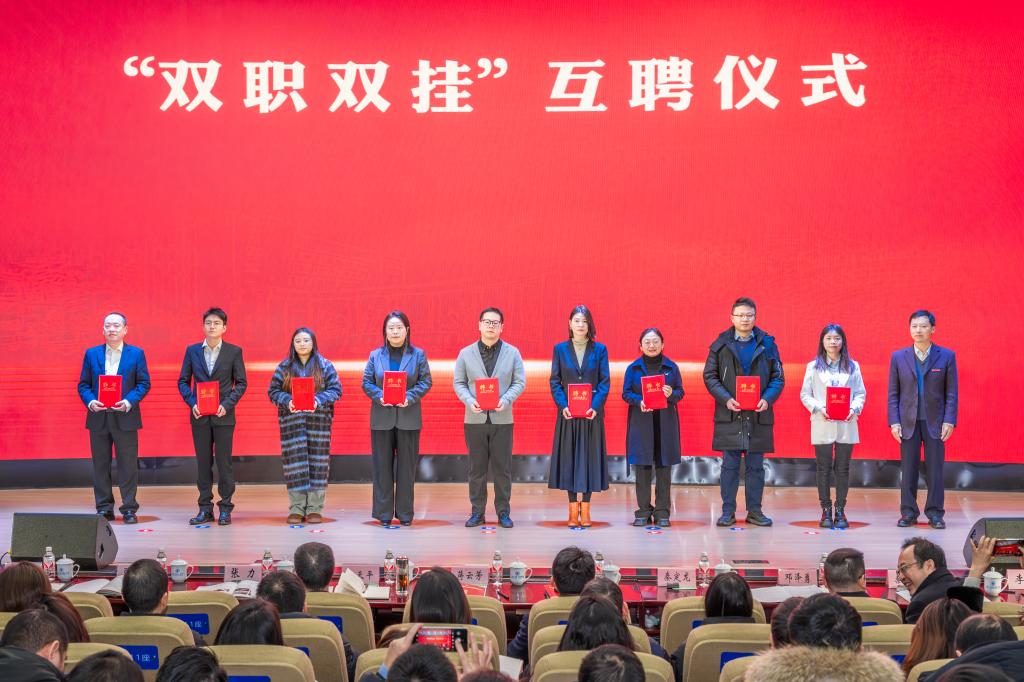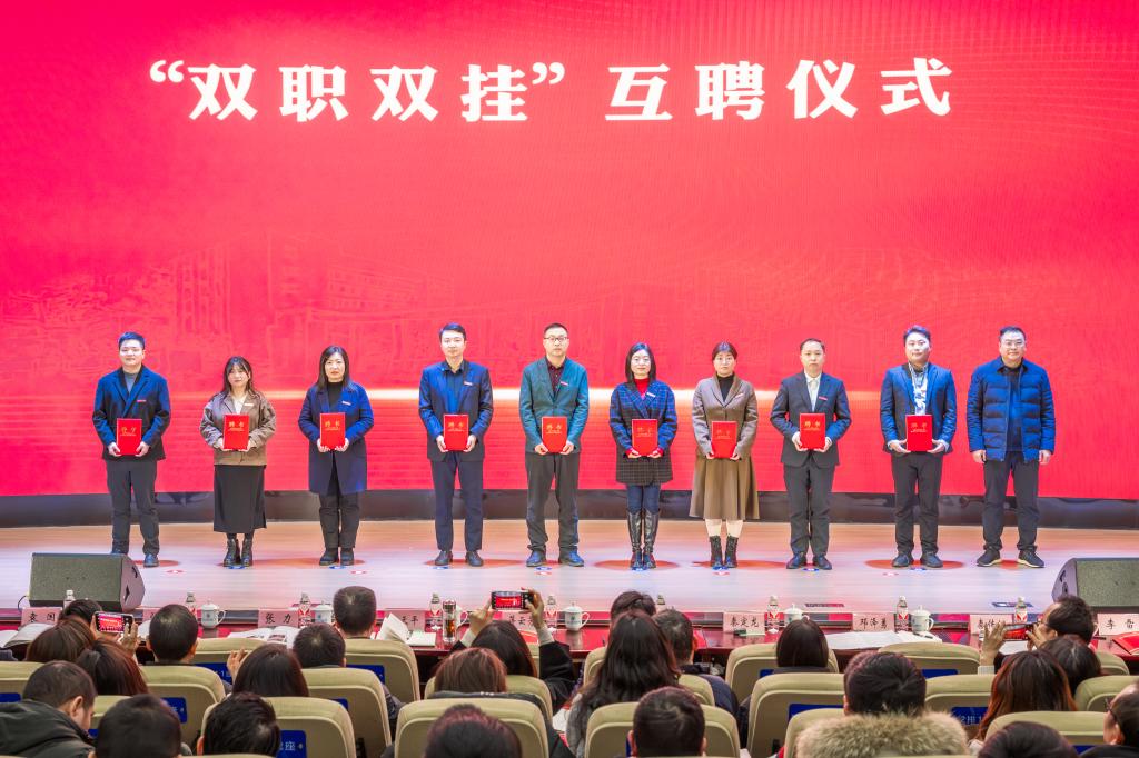 大会还举行了“双职双挂”互聘仪式。学校党委副书记张荣为来自重庆宏钢数控机床有限公司、中汽院智能网联科技有限公司等企业的“双职双挂”导师颁发聘书,重庆都宸工业技术有限公司总经理邓泽勇为学校的“双职双挂”教师颁发聘书。教师代表杨袖菊发言,表达了校企深度合作的信心和期待。