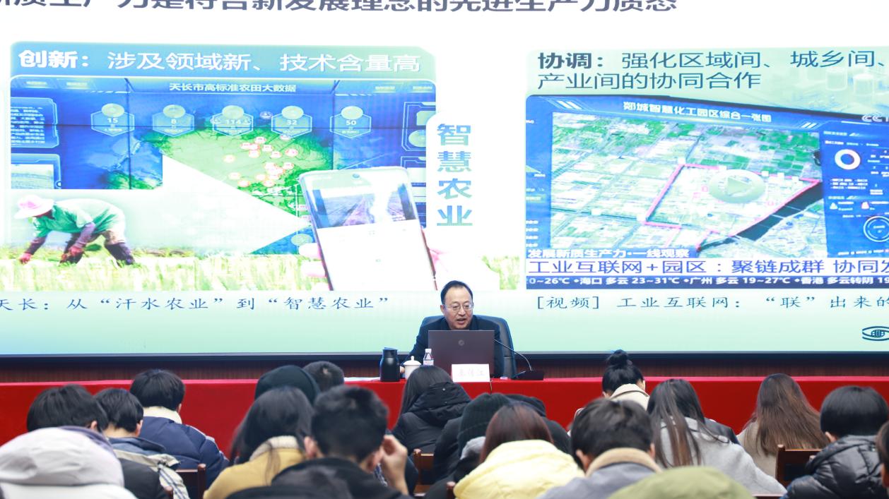 学校副院长徐兴旺以《发展新质生产力》为题向设计学院师生讲授了时长2小时的形势与政策课。他结合国内外形势,围绕“加快发展新质生产力的战略意义和重大价值、重要内涵和内在逻辑、顶层设计和具体策略”等内容展开,深刻阐释了加快发展新质生产力对于推动经济结构优化升级、促进社会全面进步的重要作用。他表示,只有扭住创新的“牛鼻子”,培养人才”强引擎“,才能推动高质量发展不断迈上新台阶。