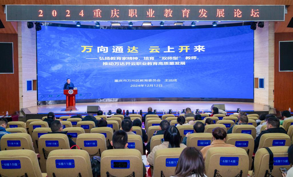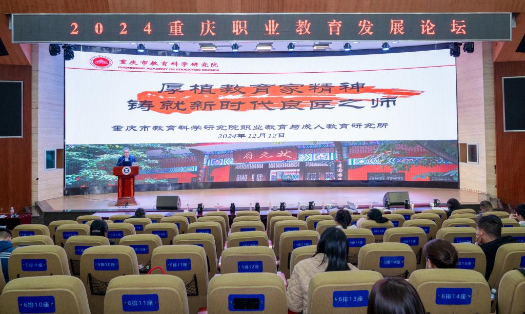 12月12日,2024重庆职业教育发展论坛在重庆工业职业技术学院第一学术报告厅召开。教育部职业教育发展中心教师发展处处长孙琳、市教委职成教处处长吴岚、高教社中职事业二部主任王素霞、市教科院院长蔡其勇、重庆工业职业技术学院党委书记郭天平出席会议。论坛围绕“大力弘扬教育家精神,锻造新时代工匠之师”主题,分为开幕式、主旨报告、论坛讲座三个部分,旨在共同探讨职业教育高素质专业化教师队伍建设问题。论坛开幕式和主旨报告由市教科院职成教所所长胡彦主持,论坛讲座由市教科院职成教所副所长周永平主持。